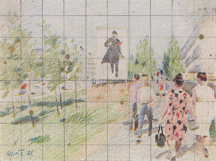 Erik Bulatov, Etude de la rue Krasikov, 1977. Crayon sur papier. 18 x 24 cm. Image : Courtoisie Galerie Skopia.