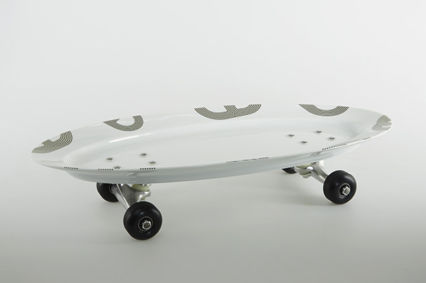 Plat en porcelaine transformé en scuplture skateboard décorative. Création : Gilles Jonemann. 58,5 x 8 x 11 x 28,5 cm.