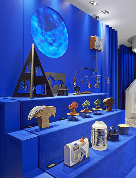 Dans un environnement bleu intense, un gazouillis d’oiseaux accompagne la découverte de vitrines au format 16:9, clin d’oeil à Hollywood, emplies de créations ludiques dont la fonction source de plaisir l’emporte sur celle pratique.