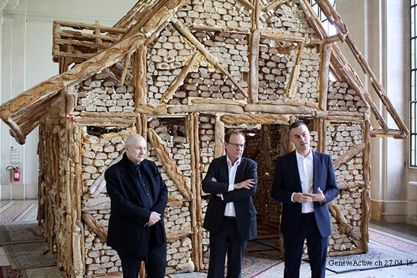 Le collectionneur Dakis Joannou, Jean-Yves Marin, directeur du MAH, et Massimiliano Gioni, commissaire de l’exposition, devant « Sans titre (Maison en pain) », 2006, de Urs Fischer.
