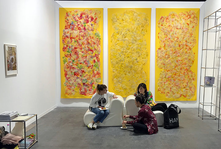 Laurence Bernard, ici avec, à sa gauche, son assistante Cécile Togni, est également extrêmement satisfaite de la participation de sa galerie à l’événement. A gauche : Angelika Markul, « Terra del Fuego », 2017; au fond : Peter Regli « RH 363, MM/AZ Mix (#1 – #24) », 2017.