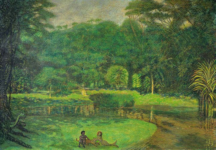 Cette lecture se retrouve dans Amigos (2021), où la forêt luxuriante devient le lieu improbable d’une coexistence entre humains, animaux et figures mythologiques. La jungle y est à la fois décor, acteur et témoin, un espace où la violence, le mythe et la coexistence se superposent. Dans l’œuvre de Gamarra, la selva incarne ainsi le théâtre de tous les conflits et de toutes les ententes humaines, un lieu où les forces de domination et les tentatives de résistance se confrontent dans un équilibre fragile.