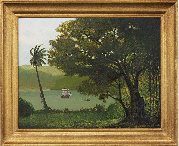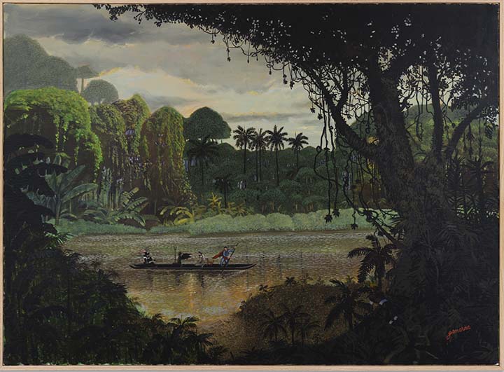Dans La Vigie (2024), Gamarra cristallise cette réflexion en représentant une pirogue traversant une rivière paisible, mais chargée de symboles. Jésus, un démon et un conquistador espagnol y côtoient Superman, figure emblématique de la culture et de la puissance américaine. En plaçant le super-héros à la barre, l’artiste suggère que le colonialisme, le prosélytisme religieux et l’impérialisme culturel trouvent aujourd’hui leur prolongement dans l’influence nord-américaine sur le continent. La scène s’inscrit dans un dialogue entre passé et présent : la domination coloniale et religieuse se mêle aux formes modernes de soft power et de projection idéologique. Face à eux, la jungle et un personnage autochtone restent les témoins silencieux de cette continuité historique, symbolisant la résistance et la résilience des peuples et des territoires face aux puissances extérieures.