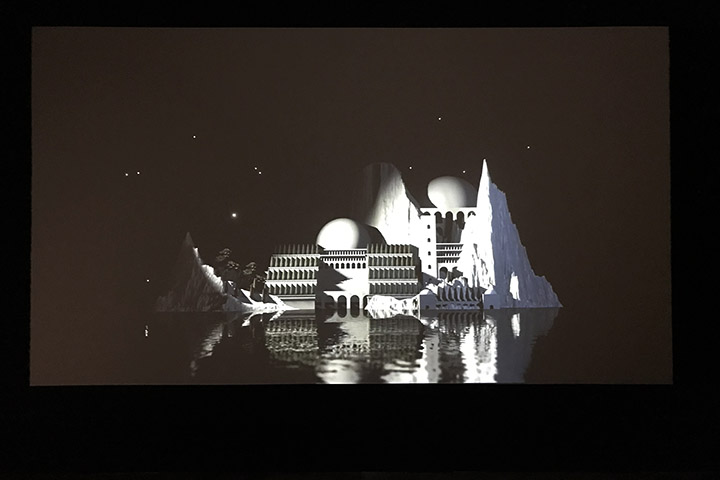 La scénographie initialement créée par Andea Bellini pour la Biennale de l’image en mouvement offre des conditions exceptionnelles de présentation en ce qu’elle engage le public dans une déambulation dans une suite de salles dans lesquelles les artistes ont eu tout loisir de créer leur propre environnement. Cette articulation de la visite rompt avec les années précédentes lorsque les oeuvres se trouvaient en concurrence dans les immenses salles du Centre d’art contemporain.