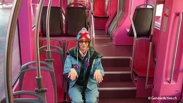 Pipilotti Rist, le 1er décembre 2016 dans le tram dont l’intérieur est aussi rose que l’extérieur.