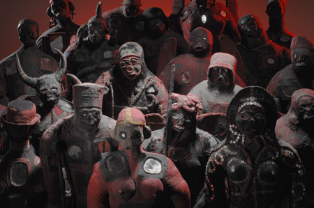 Personnages Bizango. Groupe. Tissu rembourré, os, bois, miroirs et métal.