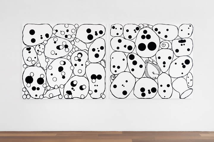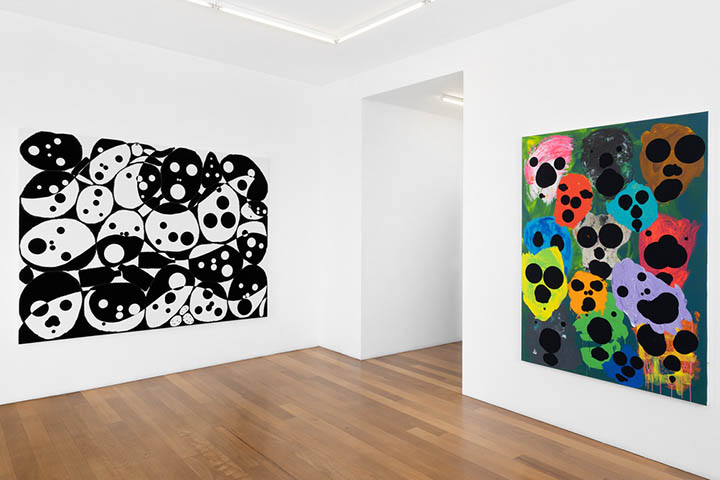 Ces figures reposent sur une structure simple et troublante : neuf cercles noirs, mats, agencés en constellation pour former un visage. Une grille presque archaïque qui convoque implicitement La Divine Comédie, avec ses neuf sphères célestes et infernales. Mais chez Tusek, pas de hiérarchie morale : chaque tête semble contenir son propre mélange de tensions, entre vice et vertu, présence et disparition. Tous partagent un même espace — celui de la toile — comme des entités contraintes à coexister.
