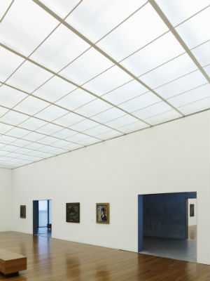 Outre cette solution et le jeu de clair-obscur entre le corridor et l’espace d’exposition, le verre joue lui aussi un rôle central. Alors que les fenêtres de la salle intermédiaire sont transparentes, le toit en verre des salles d’exposition est translucide, tout comme l’habillage de la façade, à travers lequel on devine l’isolation thermique. Lorsqu’il fait beau et qu’il n’y a pas de neige, on voit, depuis les pentes des montagnes environnantes, scintiller le toit recouvert d’éclats de verre. Pour le jury, ce bâtiment est un «friendly dinosaur», non seulement en raison de l’orientation mécanique de la lumière, mais aussi parce qu’il constitue le prototype des musées de construction horizontale exploitant les atouts de la lumière naturelle, un concept repris par de nombreux architectes.
