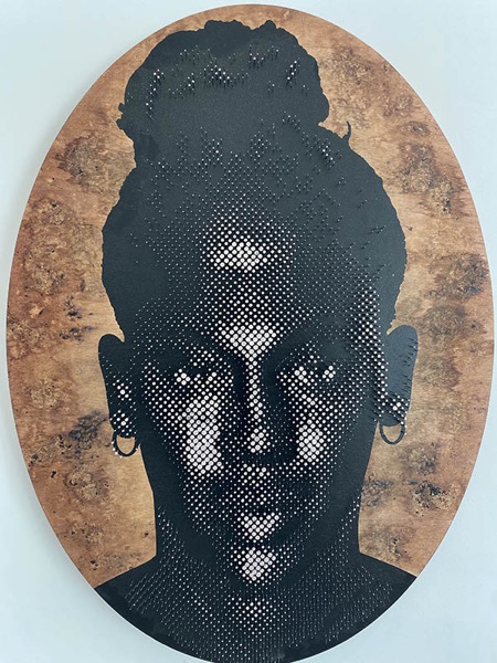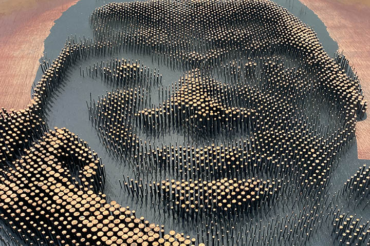 À partir de ce matériau ordinaire, l’artiste a élaboré ce que la galeriste décrit comme un véritable « alphabet ». Une fois ce langage constitué, il devient possible d’en déployer toutes les variations : portraits, séries, récits. Les visages émergent alors d’un réseau de clous enfoncés dans le bois, jouant sur la profondeur, la densité, la lumière. À distance, l’image se stabilise ; de près, elle se fragmente en une constellation de points métalliques. L’œuvre oscille constamment entre figuration et abstraction, dépendant du regard, de l’angle, de la lumière.