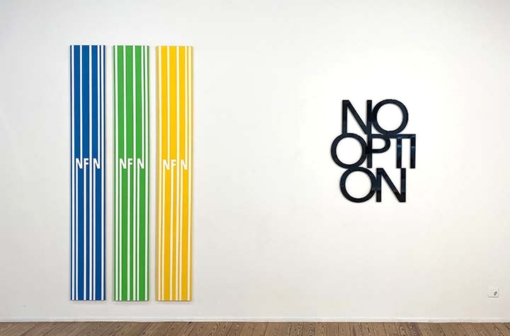 Le mot se détache aussi de la toile, s’accroche autrement au mur, découpé dans du métal laissé brut, marqué de traces de disqueuse. Laqués noir, cercles, droites et obliques se combinent en « No option », en lettres capitales.