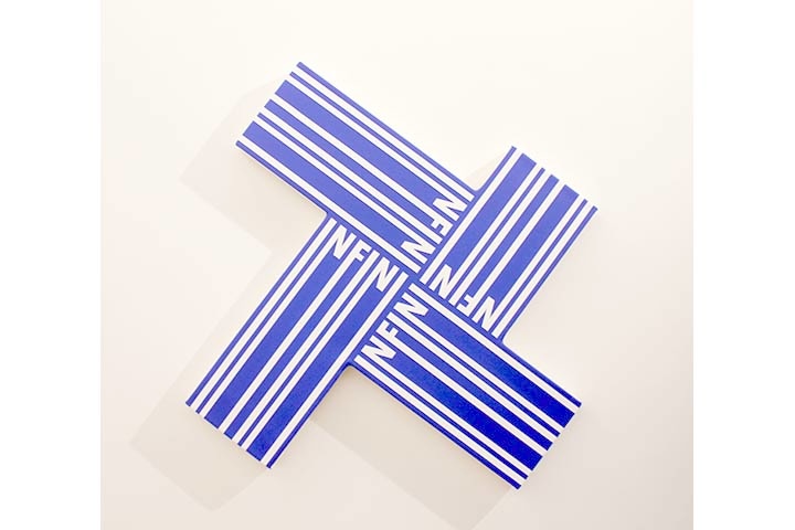 Les lettres de « Infini », mais aussi de « Minimum », se prolongent en lignes créant des rayures ou se croisant en grille. Leur étirement crée un rapprochement avec la peinture géométrique. Certaines toiles sont découpées plus près des mots. Répétés, ils se croisent ; tête-bêche, ils forment une croix en suivant leur trajectoire. Infinies, les possibilités, même en retenant un minimum de paramètres : « Over and over and over ».