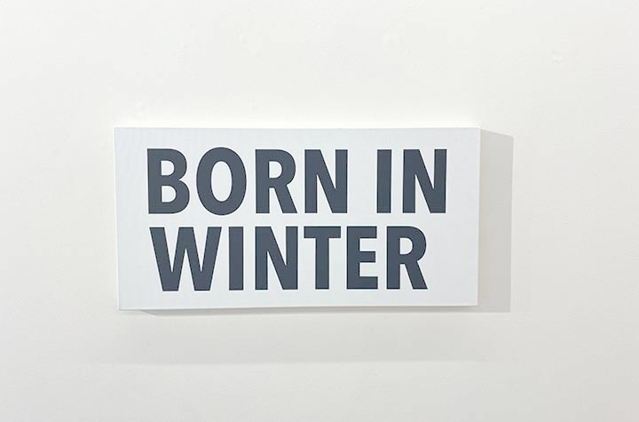 « Solo » de Christian Robert Tissot est à la fois couleur et écriture : le mot est le motif, violet sur fond blanc. Il fait référence au monde de l’art, au solo show, tout comme « Opening » renvoie au vernissage de l’exposition, « Vanishing » à la volatilité du succès, « Collector », en lettres pop sur fond orange et jaune, au collectionneur et au « revival seventies ». « New is not new » suggère que la capacité d’invention, vertu cardinale de l’art depuis les avant-gardes, serait une illusion. « Né en », formule consacrée de la biographie d’artiste, n’est pas suivie d’une date mais d’une saison. « Born in winter » est à la fois concession à l’autobiographie et dérision d’un artiste qui ne se raconte pas, dont l’œuvre ne progresse volontairement pas et échappe ainsi, pour ainsi dire, au temps.